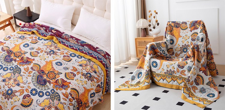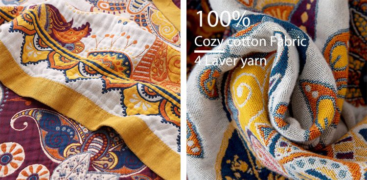 Crafted with yarn-dyed cotton and a lush 4-layer weave, it wraps you in breathable warmth that’s never stuffy—perfect for midday office naps, lazy sofa lounging, or adding a vibrant focal point to your bedroom. Its eye-catching floral paisley pattern blends bold colors with intricate details, turning a functional blanket into a statement piece that elevates any space.
